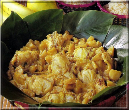 2.Dans une grande cocotte, faire suer quelques minutes les échalotes dans l'huile chaude. Ajouter morceaux de poissons, jus de citron, rondelles de banane, dés de pomme, coriandre, curry et sel. Verser le lait de coco et un peu d'eau, pour que la sauce arrive à mi-hauteur du poisson. Couvrir et laisser cuire 15 mn à feu doux.