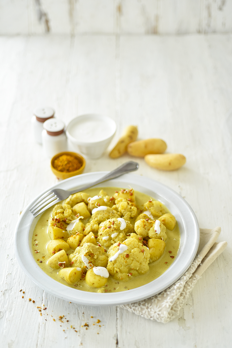 ②• VERSEZ l’huile dans une grande sauteuse, puis faites revenir l’ail et l’oignon hachés à feu moyen pendant 3 min. Ajoutez le chou-fleur, les pommes de terre et le curry. Mélangez pendant 1 min sur le feu.