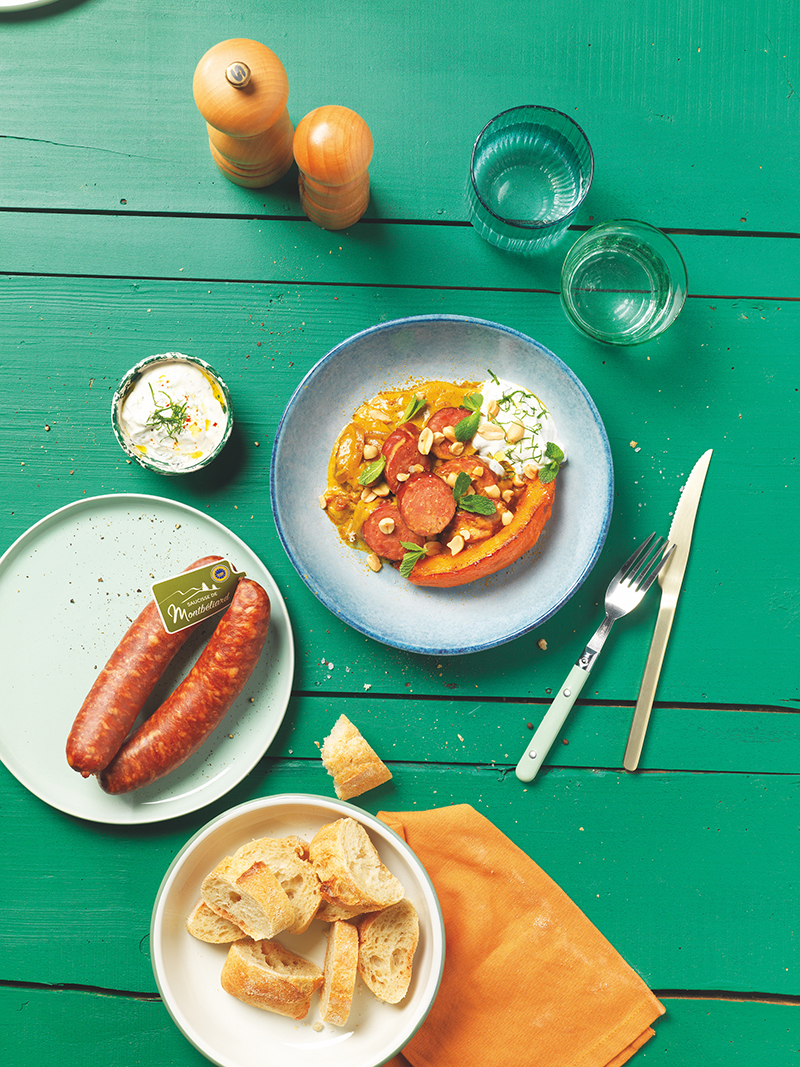 Curry de Saucisse de Montbéliard IGP, potimarron rôti, yaourt menthe-citron vert et cacahuètes