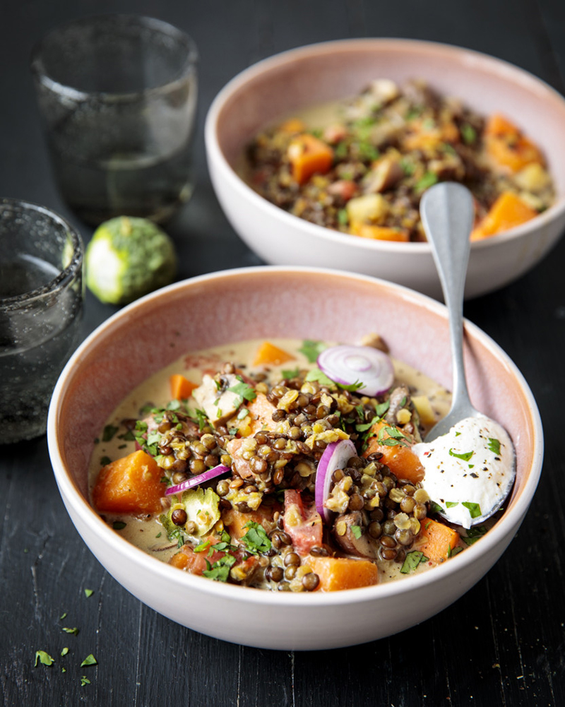 Curry vert de lentilles vertes, champignons de Paris, butternut et coriandre