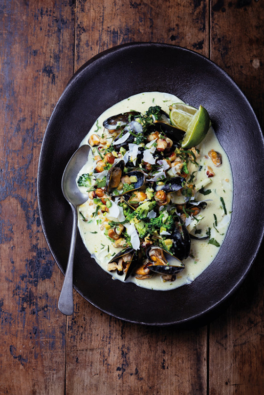 Dressez le tout dans des assiettes, parsemez de coriandre, de zeste de citron vert et de copeaux de noix de coco.