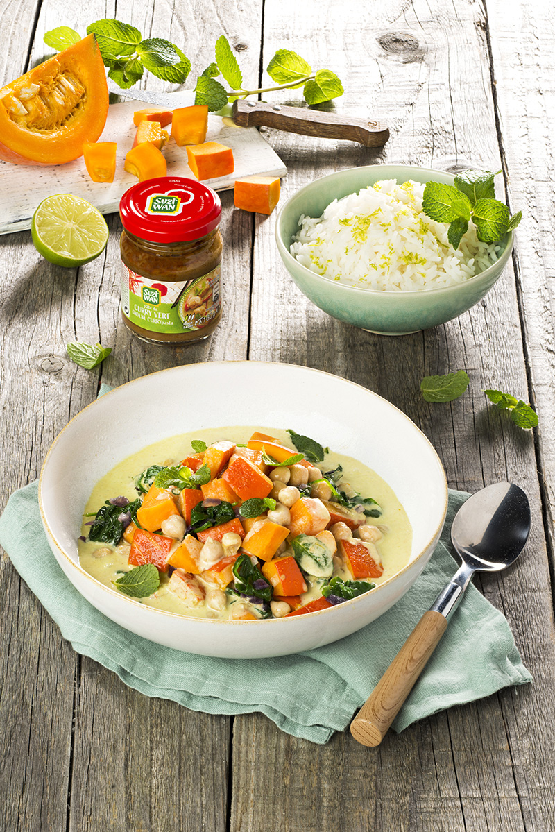 Curry vert de potimarron, pois chiches, épinards et patate douce