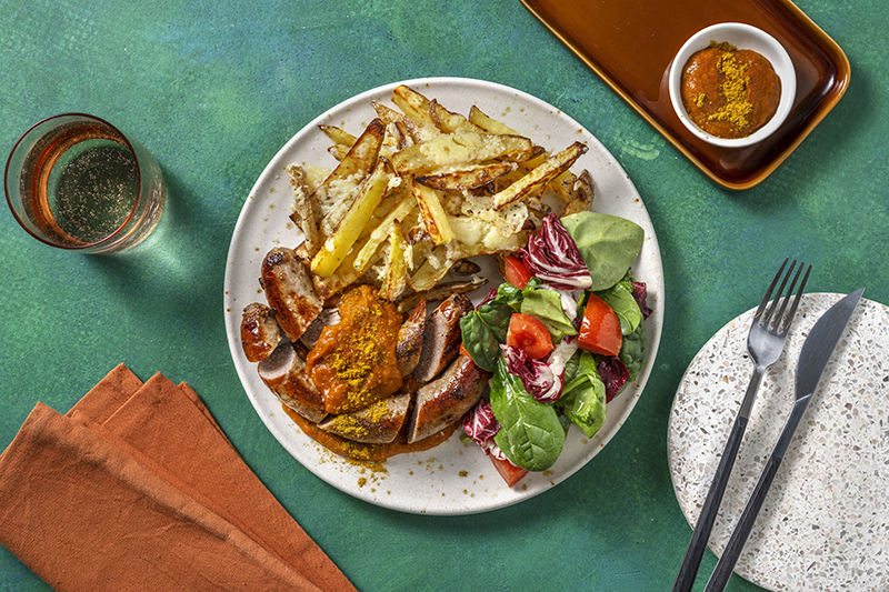 Avec sa sauce ketchup curry maison et ses frites au cheddar, c'est le plat parfait à déguster devant la télé.