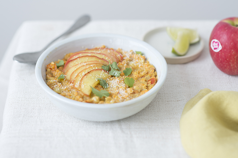 Cette recette saine et nutritive marie parfaitement bien les lentilles aux saveurs orientales du lait de coco et du curcuma adoucies par les pommes Pink Lady® : une entrée qui va épater vos invités !