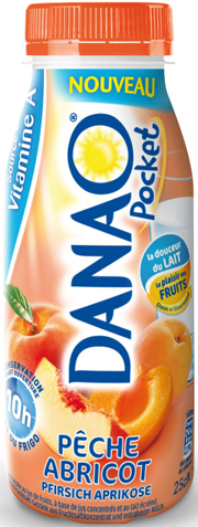 Danao Pocket, c’est une petite bouteille transportable de 25 cl qui se conserve 10h hors du frigo et associe la douceur du lait à la gourmandise du jus de pêche et du jus d’abricot.
