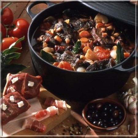 4.Garnir le fond d’une cocotte avec le reste de la couenne blanchie et ajouter la viande. Mouiller avec la marinade et ses légumes, ajouter les olives et les tomates pelées et épépinées. Couvrir hermétiquement et laisser cuire 3 h à feu modéré.