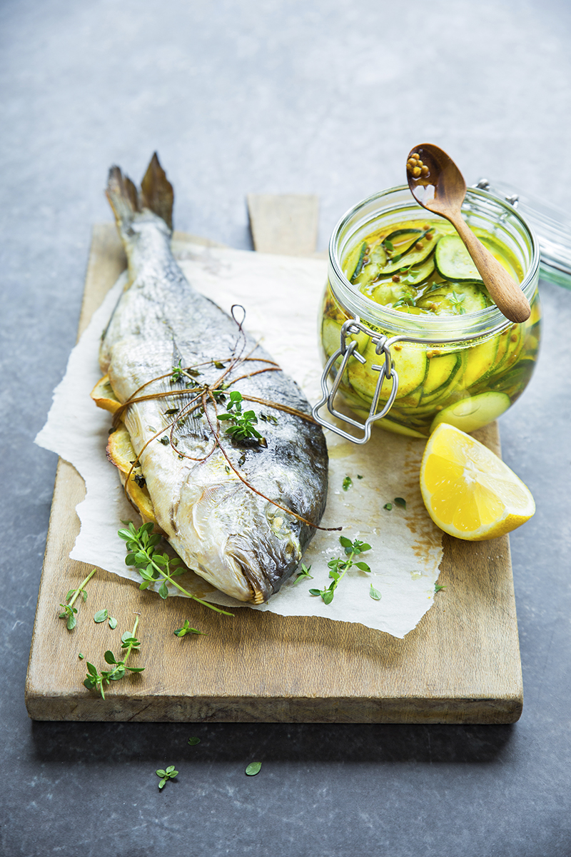 ④• Coupez le citron en fines lamelles. Assaisonnez l’intérieur des daurades de sel et de poivre puis garnissez-les de lamelles de citron et de quelques brins de thym frais. Ficelez les poissons et disposez-les dans un plat allant au four.