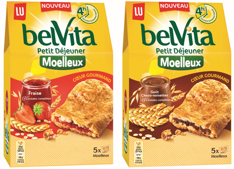 Cette année, belVita Petit-Déjeuner innove avec sa nouvelle gamme « Moelleux Cœur Gourmand » aux 5 céréales complètes, pour apporter douceur et plaisir dès le réveil avec deux saveurs ultra gourmandes « Fraise » et « goût Choco-noisettes ».
