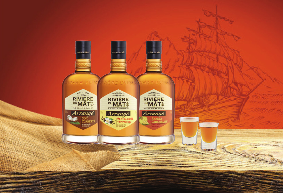 Spécialité originaire de la Réunion, les rhums arrangés Rivière du Mât sont élaborés à base de Rhum blanc de sa Distillerie, de macérâts de fruits et d’épices sélectionnées.