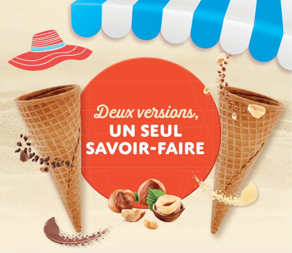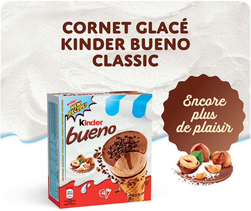 Pour redécouvrir le goût Kinder Bueno en version glacée, la crème glacée à la noisette est surmontée d’un palet au goût si reconnaissable de noisette, rappelant les coques qui renferment l’onctueuse crème dans la version barre chocolatée. Pour parfaire la sensation croustillante en plus du goût, des éclats de meringues au cacao ont été ajoutés… pour une expérience gourmande à déguster tout au long de l’année ! Au fil de la dégustation de la glace nichée dans la gaufrette, un cœur croquant à la noisette et au cacao contraste avec l’onctuosité de la glace. Ainsi, le plaisir des sensations variées continue jusqu’à aboutir à un généreux bonbon noisette à l’extrémité du cône.