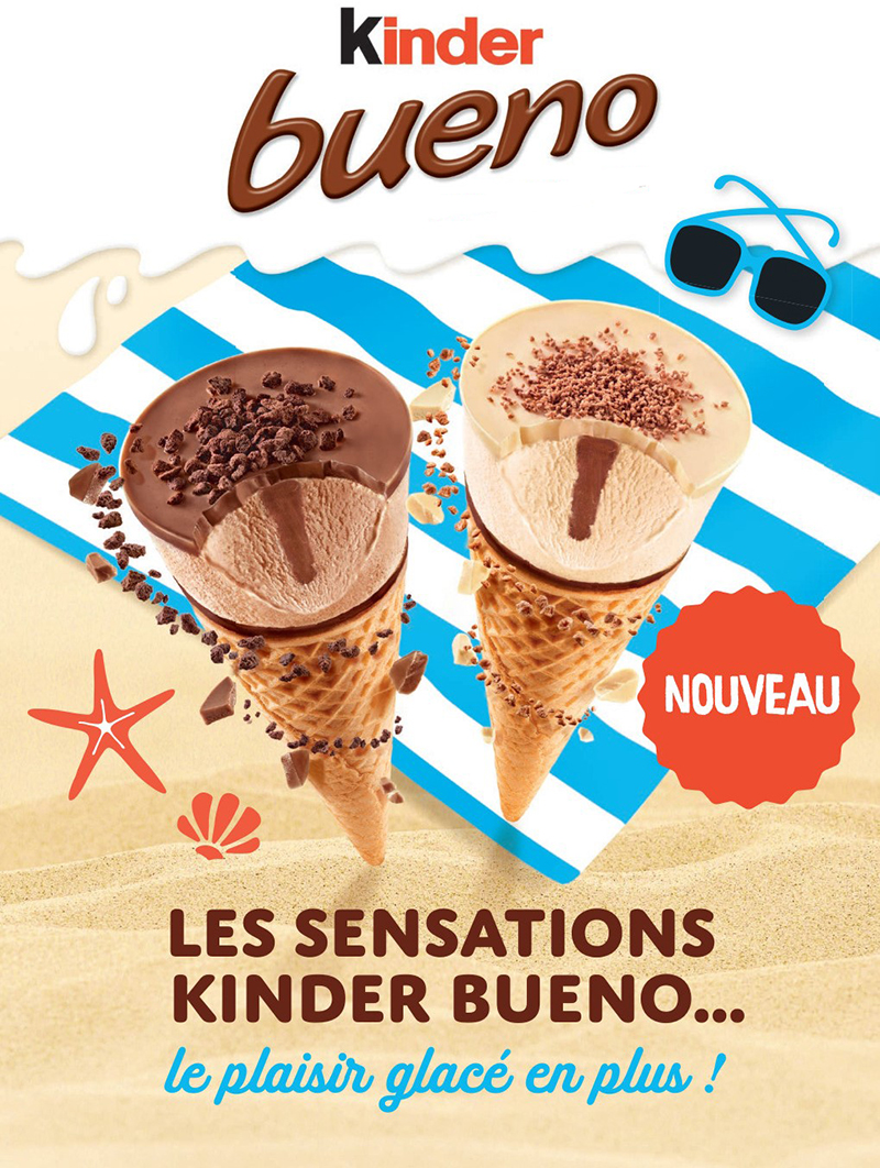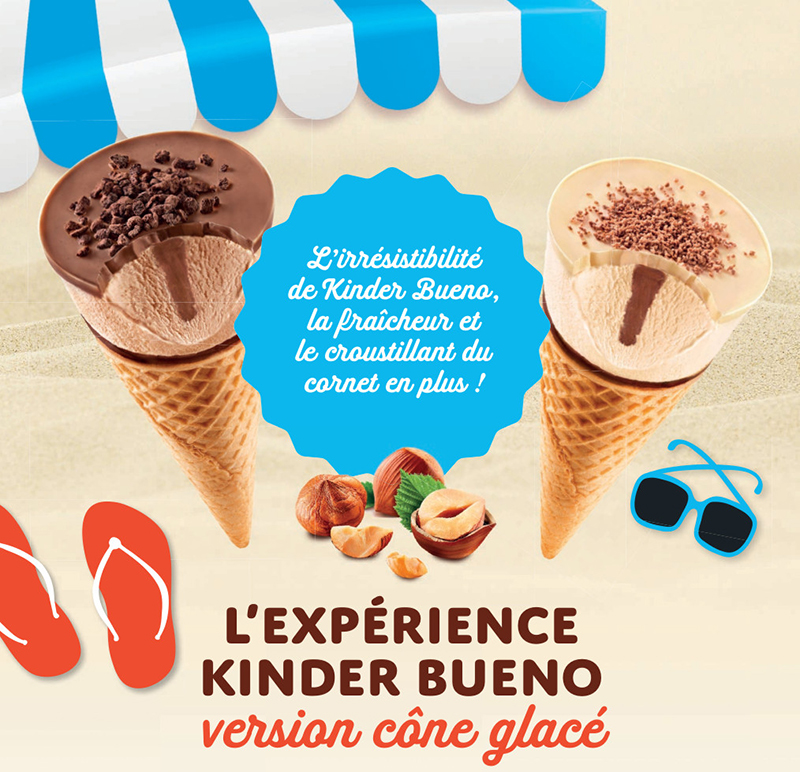 Les fidèles de Kinder Bueno le savent, le plaisir de la recette naît du mélange d’irrésistibles sensations : à la fois l’onctuosité et le croquant, mais aussi le crémeux et la légèreté. La recette glacée se devait donc d’offrir tous ces contrastes. Le goût noisette et l’onctuosité se prêtent parfaitement à une crème glacée des plus gourmandes. Pour la légèreté et le croquant, le cornet s’est naturellement imposé. Rien de tel qu’une gaufrette croustillante à souhait pour abriter la crème glacée onctueuse et ainsi retrouver toutes les sensations de Kinder Bueno !