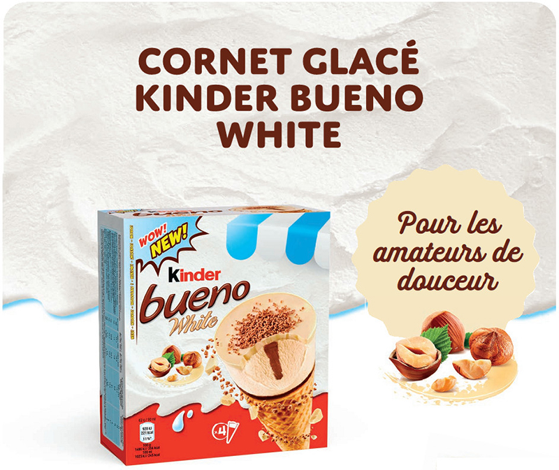 Les adeptes du Kinder Bueno version white peuvent aussi retrouver tout leur plaisir dans cette nouvelle version. La glace à la noisette onctueuse est abritée dans une gaufrette croustillante, et s’enroule autour d’un cœur croquant puis fondant au bon goût de noisette, disposé au centre du cône. L’ensemble est coiffé d’un disque blanc, parsemé des mêmes éclats de meringue croustillante adorés dans la barre au chocolat blanc.