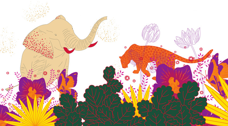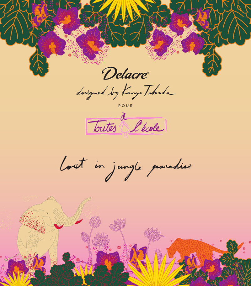 “Lorsque Delacre et Tina Kieffer m’ont demandé d’imaginer les décors de la nouvelle collection vendue en faveur de Toutes à l’école, j’ai immédiatement été séduit par le projet : soutenir l’association et donner accès à l’éducation aux jeunes Cambodgiennes. Tout au long de ma carrière, j’ai toujours soutenu le fait qu’il fallait poursuivre ses rêves, aller au bout de ses envies, et c’est grâce à l’éducation que l’on peut acquérir des bases suffisamment solides pour y arriver. Pour illustrer les boîtes, je me suis inspiré de l’une de mes premières influences : la jungle. Véritable symbole de l’équilibre naturel, ses animaux, arbres, plantes et fleurs, dans leur état le plus sauvage, donnent une illusion de mouvements perpétuels.” Kenzo Takada