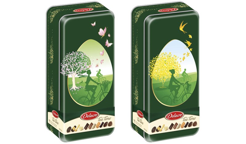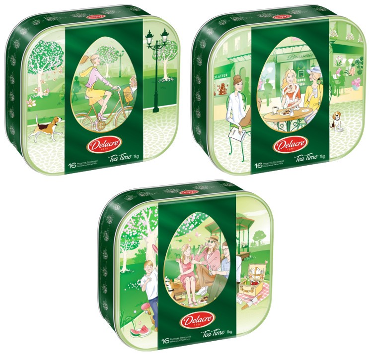 Une élégante boîte à biscuits se décline en trois illustrations colorées. Au choix, un pique-nique en famille convivial, une balade à vélo ressourçante et un goûter raffiné entre amies. À l'intérieur, chacun y découvrira les délicieuses recettes qui font la réputation de Delacre comme les Cigarettes Russes jamais égalées, la Marquisette, un biscuit sablé fondant allié à un fin chocolat noir ou encore le Biarritz, ce biscuit léger nappé de chocolat noir et saupoudré de noix de coco.