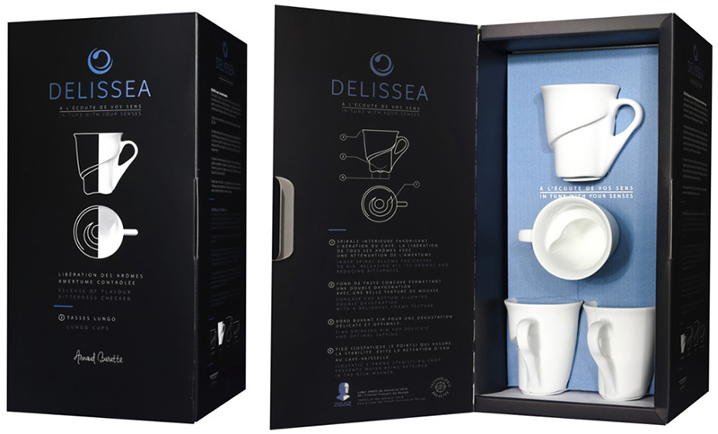 Pour que cette dégustation prenne tous son sens, avec sa collection de tasses DELISSEA, le créateur Arnaud Baratte nous fait redécouvrir le café, le thé, la tisane ou le chocolat. Protégées par un brevet pour leur technicité et un dépôt de modèles pour leur esthétisme très design, unique au monde, les tasses DELISSEA sont en porcelaine, pour des raisons de finesse au buvant et de restitution de la chaleur. Elles sont le fruit d’un savoir-faire spécifique en termes de fabrication et ont ont été validées par des professionnels torréfacteurs.