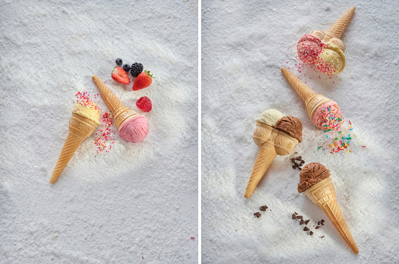 Cette méthode de fabrication leur confère de jolis formes et décors. Afin de satisfaire les petits comme les grands gourmands, 3 TOQUES les décline en simples et doubles pour accueillir une ou deux boules de gelato fait maison.