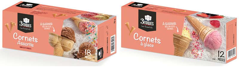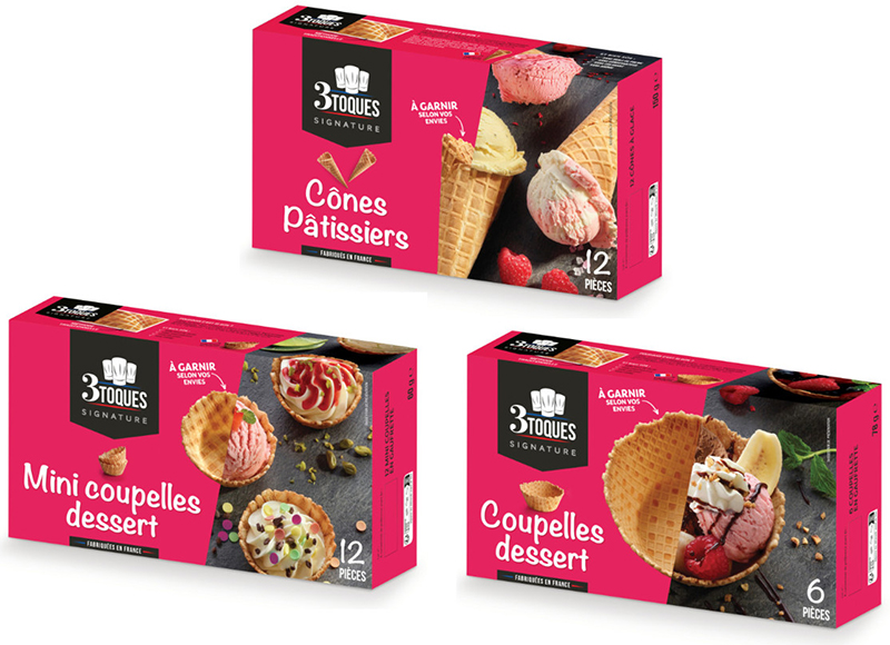 Il n'en fallait pas plus pour décider 3 TOQUES, le spécialiste du prêt-à-garnir, à lancer sa gamme de cornets et de coupelles dessert disponible au rayon aide à la pâtisserie. La gamme se compose de 5 références toutes plus croustillantes les unes que les autres. Leurs recettes sont élaborées sans huile de palme, sans conservateur, sans arôme ni colorant pour s'accorder un petit plaisir glacé sans culpabilité.
