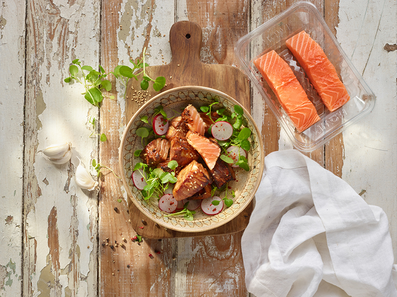 ①• Retirez la peau des pavés de saumon MOWI® et les découper en cubes. Les faire dorer dans une poêle avec une cuillère à soupe d’huile de votre choix.