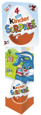 Le personnage iconique de Kinder, Kinderino, cache un assortiment de chocolats Kinder : Kinder Chocolat, moulage Kinder lapin, Kinder Suprise et Kinder Schoko-Bons.