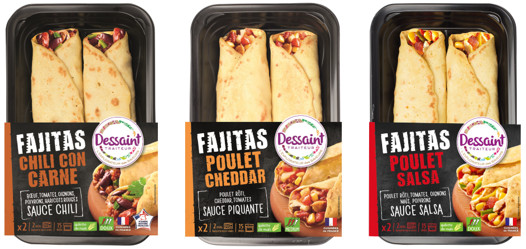 Sur le dynamique marché des produits Tex-Mex, Dessaint Traiteur propose une alternative aux produits existants aux rayons épicerie salée (kits) et surgelés, avec des fajitas garnies, au rayon frais (traiteur LS). Ces trois recettes, inspirées de la tradition mexicaine, sont présentées dans un emballage malin, permettant de les réchauffer en 2 minutes au micro-ondes.
