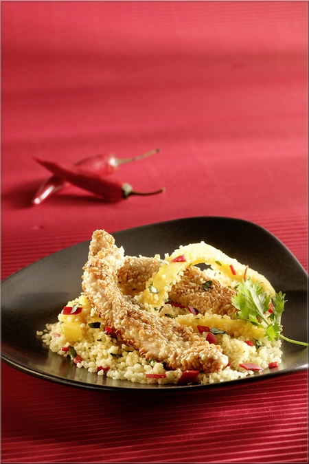 5• Plonger le couscous 1min30 dans de l’eau bouillante salée. Bien égoutter avant d’incorporer le beurre à l’aide d’une fourchette. Ajouter la mangue, le piment et la coriandre ciselée.