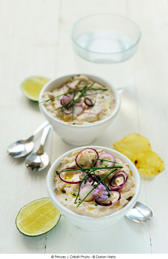 ⑥• Remplissez 2 petits bols avec le dip puis parsemez par dessus quelques fines tranches d’oignon, quelques tiges de ciboulette et quelques gouttes de l’huile d’olive.