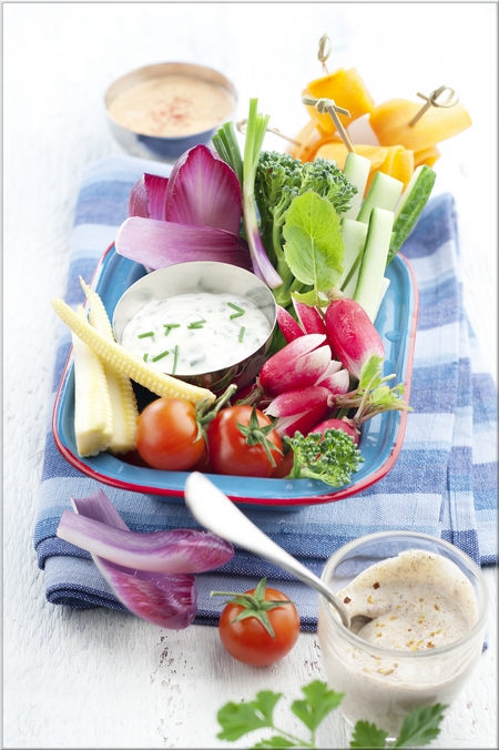 Placer tous les légumes dans un plat de présentation accompagnés des 3 sauces.