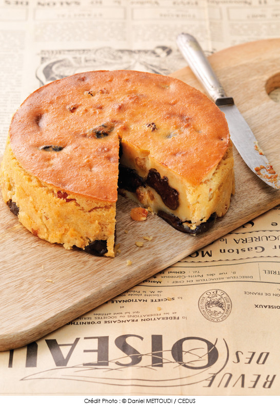 ③• Egoutter les pruneaux et les raisins secs puis les incorporer à la préparation. Si elle est trop compacte, la détendre avec un peu de thé. Faire fondre le beurre et l’ajouter à la préparation en mélangeant. La verser dans le moule puis enfourner au minimum 1 h, jusqu’à ce que le diplomate soit bien doré. Prolonger la cuisson si nécessaire.