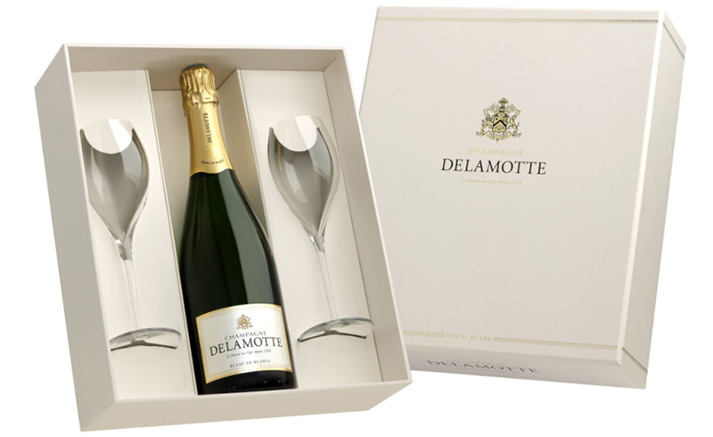Une bouteille de Delamotte Blanc de Blancs et ses deux verres tulipe : 45 € – Format 75 cl