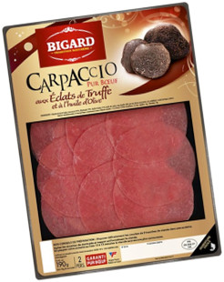 Spécialiste du carpaccio, Bigard se réinvente et pare ses fines tranches de bœuf fondantes d’une délicieuse marinade associant huile d’olive, vinaigre de Xérès et de véritables éclats de truffe.