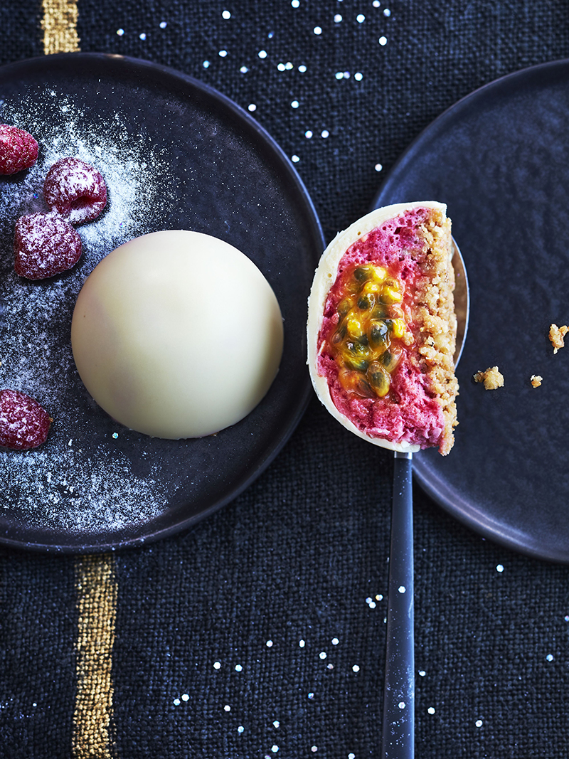 Dôme de chocolat blanc à la mousse de framboises, cœur au fruit de la passion et croquant de palet breton et pralin