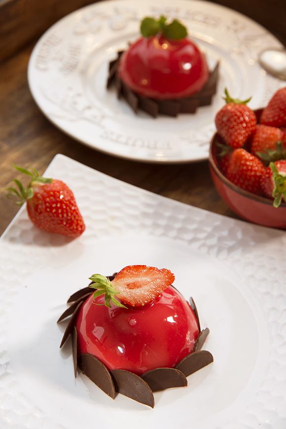 – Décorer le tour avec des pastilles en chocolat et déposer une fraise coupée en deux sur le dessus.