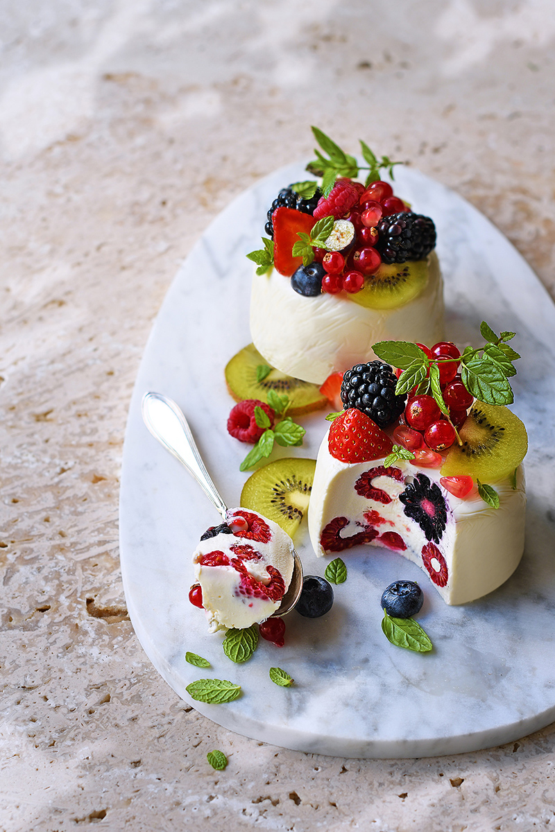 Au moment de servir, démoulez délicatement sur des assiettes à dessert, ôtez le film, décorez avec les fruits restants et des feuilles de menthe.