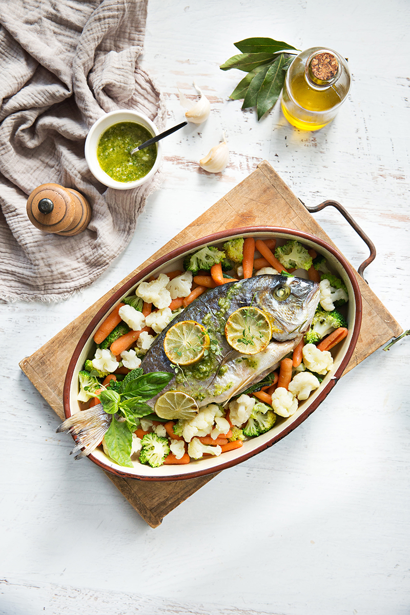Servir la dorade accompagnée des légumes rôtis et de la sauce pesto.