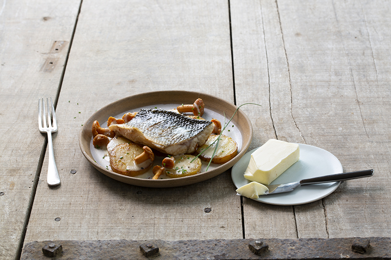 Dos de bar rôti sur peau aux girolles et beurre Charentes-Poitou AOP