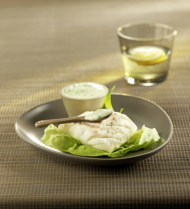 ①• Déposer la laitue dans le cuit vapeur et ajouter le cabillaud assaisonné. Cuire 15 minutes.