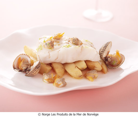 Dos de Skrei de Norvège à la vapeur de citron vert, coques et pomme de terre fondantes