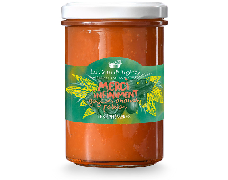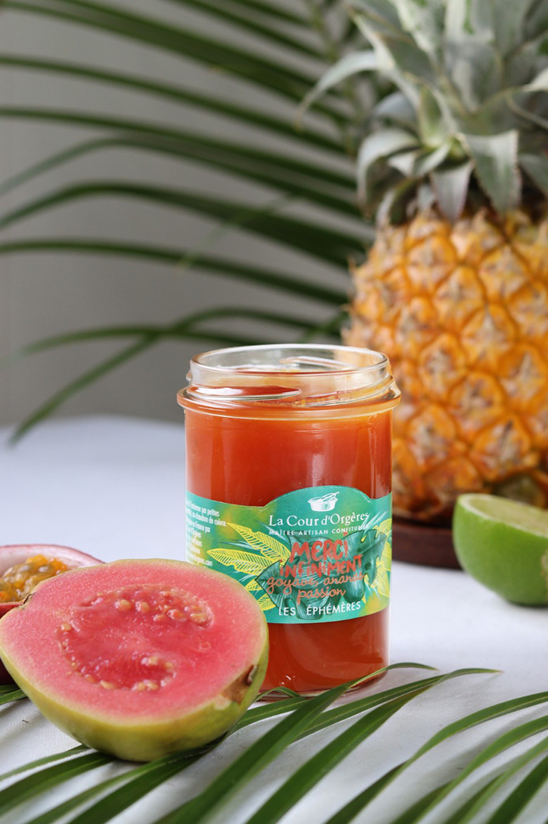 Dans ses chaudrons de cuivre, la maitre confiturière de la Cour d’Orgères a longtemps fait mijoter le soleil des tropiques. De la goyave pour la douceur, de l’ananas et des fruits de la passion pour quelques notes plus acidulées, un trait de citron vert… Une recette éblouissante, qui illumine les tartines du petit-déjeuner et les crêpes de la chandeleur mais s’invite aussi dans les cheesecakes, les pavlovas, les verrines de fruits, les pommes au four et les plateaux de fromages…