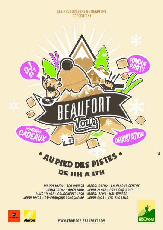 … de nombreux cadeaux, dont une paire de ski DYNASTAR et un appareil photo Nikon à gagner chaque jour. Rendez-vous au « village » Beaufort où un bulletin réponse attend les skieurs et les promeneurs. Un tirage au sort effectué par Beaufortine, la mascotte du fromage Beaufort, aura lieu dans chaque station en fin de journée.