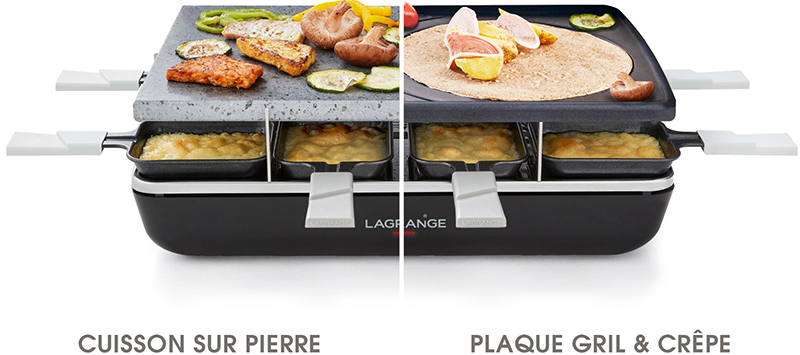 Avec cette nouvelle raclette Élément, LAGRANGE propose un appareil multifonction qui élargit le champ des possibles pour les grandes tablées conviviales. Il combine quatre dispositifs différents pour satisfaire tous les gourmands. Une diversité de recettes en un seul produit fidèle à la recherche de solutions astucieuses chères à la marque. Multifonction au besoin mais toujours dans la simplicité ! Les deux plaques de cuisson sont amovibles facilement pour varier les recettes en fonction des envies. Petit plus malin, la pierre de cuisson naturelle permet de cuire les aliments facilement et sans ajout de matières grasses. En quelques minutes, la température idéale est diffusée sur toute la surface de la pierre pour permettre aux viandes et légumes d’être saisis à la perfection.