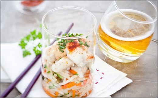 3• Coupez les filets de poisson en morceaux ou en cubes selon leur épaisseur. Faites chauffer le beurre dans une cocotte et faites dorer les morceaux de poisson. Égouttez-les à l'aide d'une écumoire et mettez la julienne de légumes à la place. Laissez-la revenir 10 min. Remettez le poisson dans la cocotte, salez, poivrez. Versez la sauce soja dans la réduction de cidre, ajoutez le paprika et la crème. Remuez, versez dans la cocotte, couvrez et laissez mijoter 15 min.