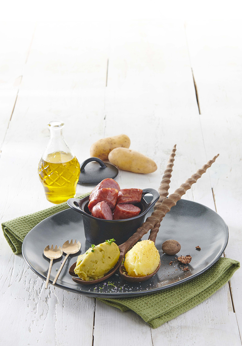 Duo de purées de pois cassés et Pompadour Label Rouge, saucisse de Montbéliard