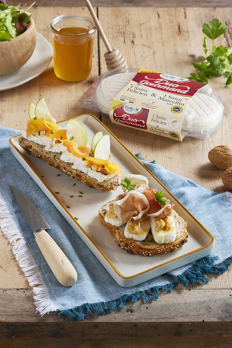 Saint-Marcellin IGP, noix de Grenoble AOP, jambon de Savoie et miel Saint-Félicien, truite du Vercors, pomme verte et noix torréfiées. Pour un repas facile et rapide qui sent bon les beaux jours, l’Étoile du Vercors dévoile ses recettes inédites de tartines sucrées salées à base de ce duo gourmand de fromages de terroir.