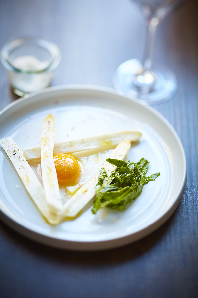 Eau des salines de Guérande, asperges blanches à cru, jaune d’œufs maturés & fleur de sel Le Guérandais
