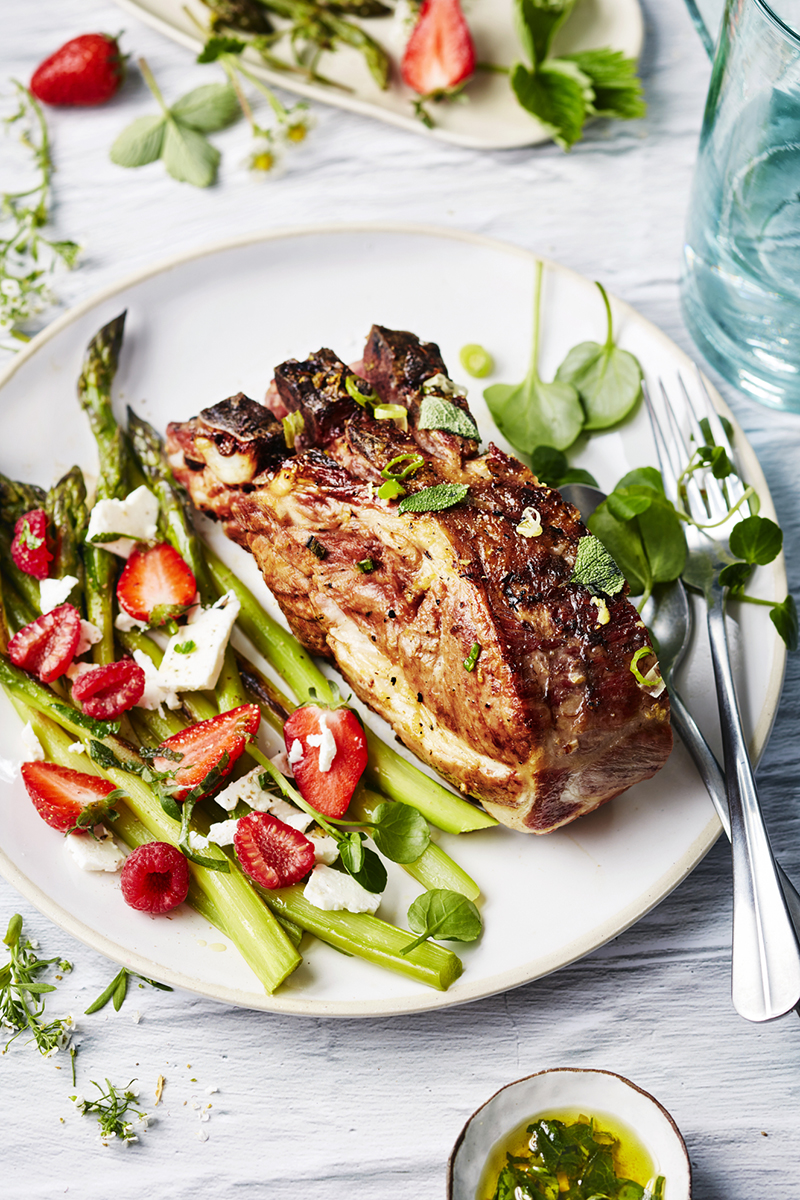Échine de porc Bio au barbecue, asperges vertes rôties et feta, fruits rouges