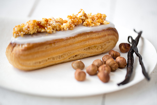 – Fouetter la crème pâtissière froide, puis couper les éclairs en deux, en garnir la base.