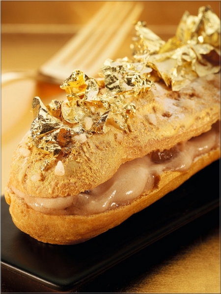 12.Napper les éclairs de glaçage avec un pinceau, puis saupoudrer de poudre d’or. Les couper en deux dans le sens de la longueur et les remplir de crème aux marrons.