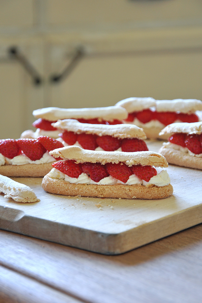 ③• Garnir la base de biscuit de chantilly (ou de mascarpone légèrement sucré), piquer les morceaux de fraise puis refermer l’éclair.