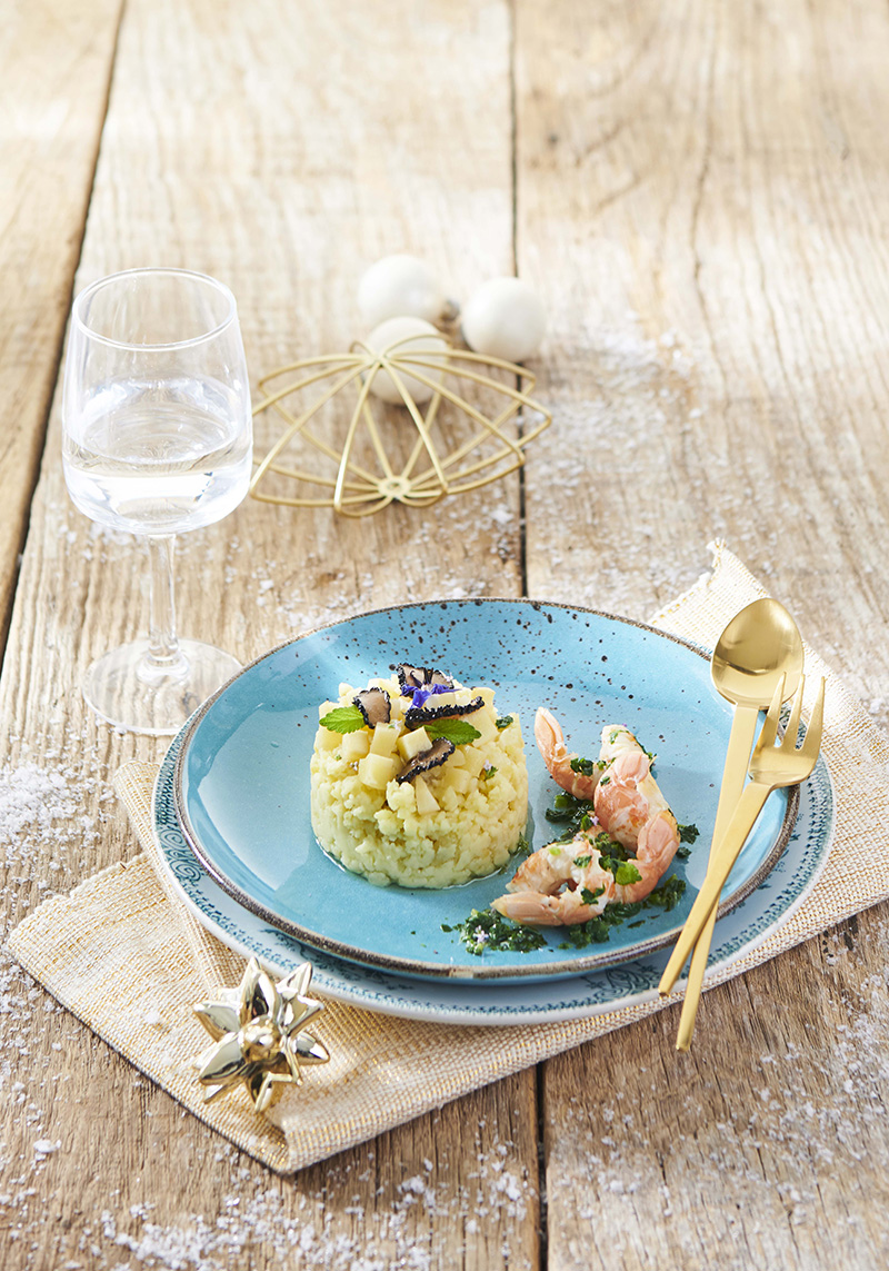 ⑤• DRESSEZ l’écrasé de Ratte du Touquet et de panais à l’aide d’un emporte-pièce, posez au-dessus quelques dés ainsi que des lamelles de truffe.
