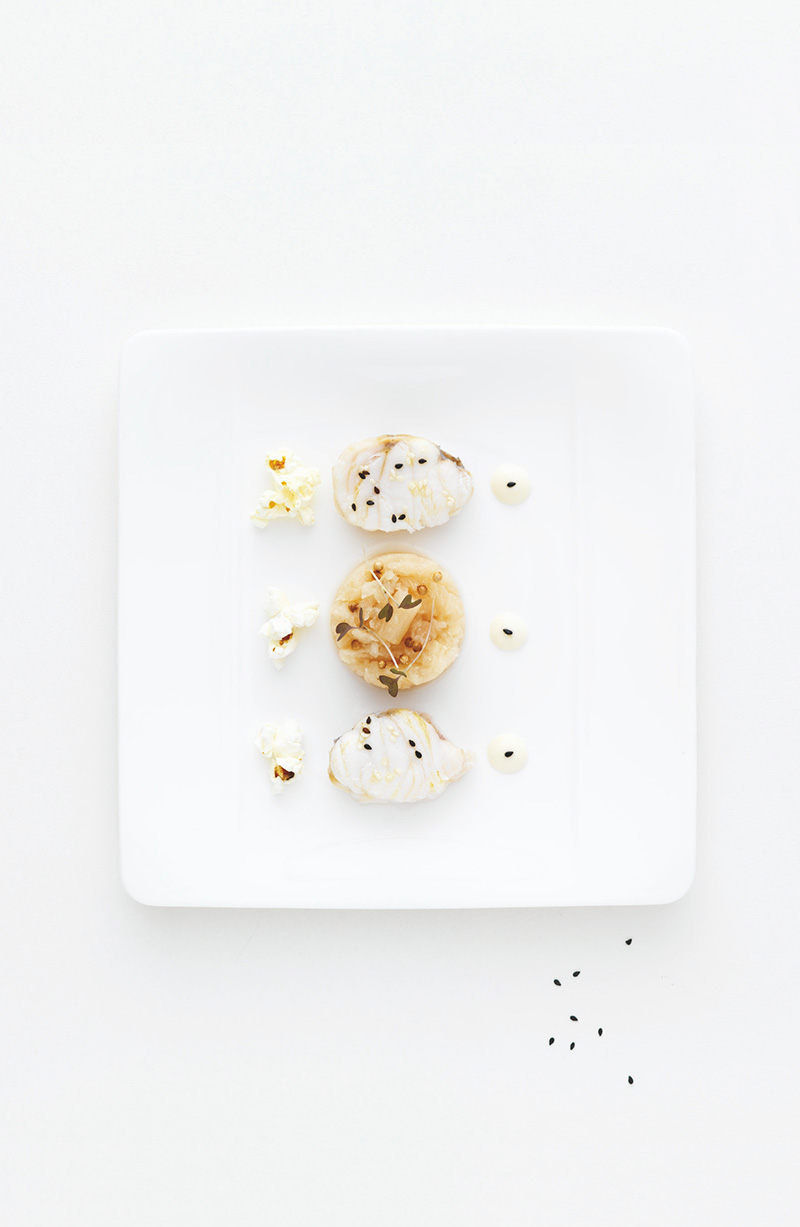 Écrasés de salsifis, médaillons de lotte et pop-corn